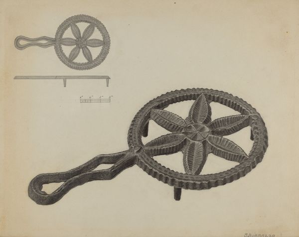 Curator: There’s a certain stillness in this drawing. A quiet reverence for the everyday. Editor: It’s functional but elevated. Almost austere in its presentation but softened by the little heart shape on the handle. Curator: This is a pencil drawing dating from about 1938, simply titled "Pa. German Flatiron Holder," created by Salvatore Borrazzo. The subject itself is fascinating – a utilitarian object, probably cast iron, used to hold a hot flatiron. Editor: Yes, a very prosaic object indeed. The artist's careful rendering transforms the mundane into something worthy of attention, almost monumental in its stillness. I am particularly drawn to the use of perspective and shadow. Curator: The details certainly speak to its functionality, but the swirled pattern elevates the humble piece into a design object. This design itself is rooted in a visual language, hinting at the maker's cultural heritage and artistic sensibilities. The repeating circular forms evoke concepts of wholeness, perhaps referencing eternity, like rings without end. Editor: These motifs do remind me of the aesthetics found on Pennsylvania Dutch fraktur, but removed from devotional uses. How would the original user interpret the same design features? This was an object displayed in the domestic sphere, representing the role of labor in the maintenance of the family home. Curator: It suggests an interesting negotiation. Functional tool, but imbued with meaning that potentially speaks to both practicality and a broader understanding of order and interconnectedness in life. It transforms the purely functional into something richer. Editor: The image's austerity gives a sense of dignity to the artifact represented. Curator: And a reminder, perhaps, to find beauty and significance in the ordinary objects that shape our lives and the broader socio-cultural narrative they inhabit. Editor: Precisely. The art lies not only in its functionality, but also the cultural meanings layered into something we now may see only as kitsch.