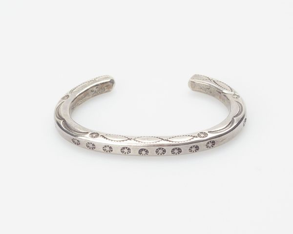 Curator: Let's delve into this eye-catching Pueblo silver bracelet. Although its exact date is unknown, it resides here at the Minneapolis Institute of Art. What are your immediate impressions? Editor: It has such a strong presence! Despite its size as jewelry, those deeply etched, repeating chevron patterns give it a bold, almost architectural quality. There’s a primal energy to the design. Curator: Indeed. The chevron, or arrow motif, is significant in Indigenous cultures of the Americas. They symbolize direction, power, and, crucially, paths of life or journeys. We might also think about the political history here: decorative silverwork arose in the Southwest during periods of significant resistance and cultural revitalization, where Native artists began using newly accessible materials to challenge colonizing forces. Editor: That’s fascinating! And seeing it now, I also notice how the repetitive chevron pattern echoes waves or perhaps even the feathers of a bird in flight. Silver, as a material, even in this somewhat tarnished state, seems to amplify this association, adding connotations of freedom and spirituality. Is there any indication of its gender association, culturally? Curator: Silverwork like this would have been worn by both men and women in many Pueblo communities, often on ceremonial occasions or as markers of status and identity within a complex kinship system. I want to think about the wearer; this piece probably has witnessed a great deal of change across generations. Editor: The beauty is there whether you view it with an eye for form or material; either way, its existence provides a unique connection to the past. Curator: Absolutely, a potent reminder of resilience, resistance, and the enduring strength of Indigenous artistry. Thank you. Editor: It's always amazing to view artworks such as this in an intersectional, inclusive lens, where meaning accumulates the longer we observe.
