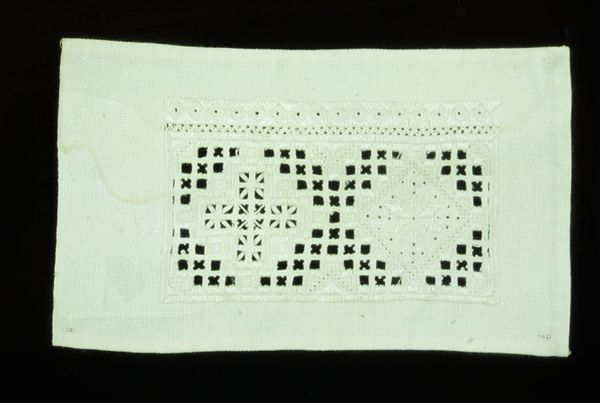 Curator: Oh, this reminds me of something you'd find in a fairytale, like trim on a queen's sleeve. Editor: That's fascinating. This anonymous "Head-piece" from the Harvard Art Museums presents an interesting case for understanding the social history of adornment. Curator: You think so? It feels quite...decorative, you know? Like the kind of thing someone would mindlessly doodle. Editor: Well, the repetition itself could be interpreted as a commentary on the constraints placed on women's creativity in certain historical periods. Perhaps adornment was one of the only available outlets for self-expression. Curator: Hmmm. It's a bit small to make a grand statement, don't you think? Editor: Its small scale doesn't negate its potential significance. Think about the subversive potential of a tiny, handmade object carrying coded meanings. Curator: Coded meanings... I was thinking it was just a pretty pattern. It's funny how different our eyes see the same thing! Editor: Indeed, and that’s precisely what makes art, and its contextualization, so powerfully dynamic.