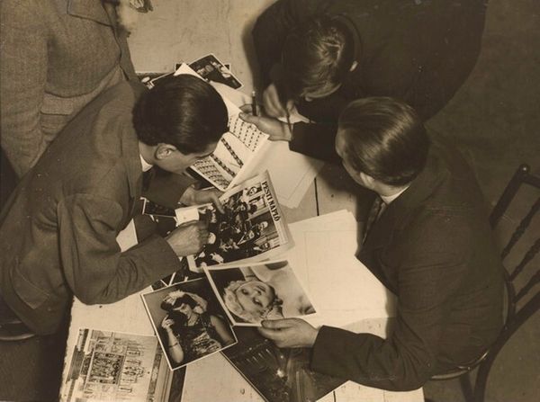 Curator: Looking at this gelatin silver print by Robert Frank, titled "Festival--Children," created around 1941, my immediate reaction is how grainy and intimate it feels. The almost haphazard composition, combined with the limited grayscale, gives it an arresting documentary quality. Editor: Indeed. The coarseness emphasizes the act of labor itself – hands at work, processing food, presumably for some larger communal gathering. One can almost feel the materiality of the bread, or whatever food they are cutting, and consider its consumption as an event. Curator: Absolutely, and the contrast further emphasizes the mundane actions occurring within the larger framework. The visual balance seems off-kilter. Our eyes focus not on faces, but rather the repetition of hands around the table and the small pitchers near the edge of the frame. It destabilizes the central act as the print leads the eye on a journey around the space of labor, rather than drawing the viewer directly to the figures at the table. Editor: Precisely, and it's through understanding these details that we start thinking about how labor is organized and distributed within the frame, right down to those miniature cups, echoing themes of both community and individual portions. There’s a direct correlation here to the production of culture. Curator: To a degree, the photograph is really highlighting quotidian acts, giving significance to their process and, of course, a certain texture. It reminds us to look past what these women produce, but rather consider their own means of cultural output. Editor: That texture! One might look closer at what appears to be uniform dress amongst them and consider the conditions of their collective. Also what cultural forces put these individuals together for a Festival, specifically involving Children. Curator: Food becomes almost symbolic then - beyond sustenance to material markers of shared identity. Editor: Well put. It forces me to reflect on the tangible means of creating shared experiences; what sort of apparatus needs to be assembled in any communal expression, down to labor practices. Curator: Exactly, seeing the components on a small, more intimate scale leads to reflections on collective identity and what that truly takes. Thank you for the exchange. Editor: Agreed. A reminder that festivals are built, literally, from the ground up, bit by bit, offering food for thought on all sorts of societal feasts.