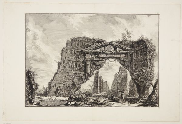 Curator: This is an engraving by Giovanni Battista Piranesi, dating from 1773 to 1776. The piece is entitled, "View of the Arch built in honour of Augustus close to the city of Aosta..." It’s part of the collection at the SMK, the Statens Museum for Kunst. Editor: What a compelling scene! The heavy, almost crude, stone of the arch set against the soft landscape has such a brooding presence, even in a small print. It feels monumental, but somehow fragile, too. Curator: I find Piranesi so interesting from a materialist perspective. Consider his choice of engraving, a printing technique allowing for mass production. His “Views of Rome” and other prints like this one weren’t necessarily considered "high art" at the time. These prints made depictions of Roman antiquity available to a wider public, functioning almost as postcards or souvenirs. Editor: Exactly. Piranesi isn’t simply presenting us with an image; he's engaging in a dialogue about power, colonialism, and the gaze. Think about who had access to these images and what it meant to possess them in the 18th century, solidifying a certain understanding and often a romanticized and self-serving narrative about antiquity. The labourers in the foreground make this explicit: their lives a stark contrast to the enduring glory of the arch. Curator: And what is so remarkable, too, is Piranesi’s hand. I’m intrigued by his labor and how he renders crumbling details with precise lines, hinting at the work of past artisans who labored to build the original arch. Also, the physicality of engraving, the marks the tools leave on the plate - those all point to human endeavor. Editor: Right. Consider too that, these detailed depictions might’ve influenced the restoration and preservation movements, intertwining art, politics, and cultural memory. Each mark serves not just as a visual element but also as a testament to how we selectively remember and value different parts of our history, all within complex sociopolitical frameworks. Curator: It really is a study in contrasts - permanence and transience, decay and memory, the individual artisan and mass production. Editor: It leaves you questioning not only what you’re seeing, but also the implications of who gets to see it and what meanings they assign to it.