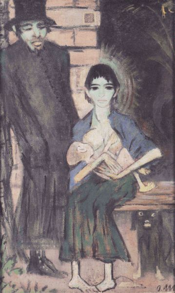 Editor: This is "Woman with Dove" by Marie Laurencin, painted in 1919. The subtle, almost melancholic, atmosphere really strikes me. The colors are so muted, and the figures have a dreamy quality. What do you see in this piece? Curator: Beyond the surface, I see echoes of longing and a subtle challenge to conventional female representation. Notice how Laurencin subverts the traditional symbolism of the dove. Typically, it represents peace, hope, innocence. Here, it perches on a document. What might that mean? Editor: Maybe a kind of transaction of peace, or perhaps a negotiated innocence? It's interesting how the androgynous figure is almost shielding the more conventionally feminine one. Curator: Precisely. Laurencin often played with androgyny, defying expectations of how women should be portrayed. Consider the era - post-World War I. The cultural landscape was shifting, and the rigid roles for women were beginning to blur. Laurencin gives us symbols of feminine co-existence. What emotions are conjured through the tonal palette of the painting and the placement of the characters within the image? Editor: A feeling of quiet intimacy and protectiveness, even vulnerability. The dove seems fragile, and both figures seem to share that sense of delicacy. The painting feels like a whisper, not a shout. Curator: It whispers a lot. The symbolism layered within speaks volumes about the evolving identities and unspoken connections between women in that transformative period, suggesting enduring resonance today. Thank you, this art truly carries cultural memory and continuity! Editor: Thanks, I really enjoyed discovering new sides to the piece with your perspective on symbolism!