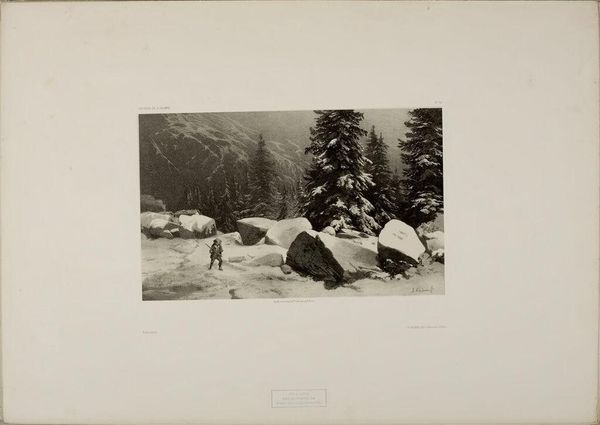 Curator: Alexandre Calame, born in 1810, rendered this striking "Landscape Number 18," which is held in the Harvard Art Museums collection. Editor: The monochromatic palette and stark contrasts give it a dramatic, almost melancholic feel, don't you think? It speaks of the sublime. Curator: Sublimity, in landscape, certainly carried symbolic weight. Mountains often represented spiritual aspiration and the power of nature, didn't they? Editor: Yes, but I'm equally drawn to the texture of those rocks. The engraver's labour has replicated the feel of the rough surface, the geological processes are right there. Curator: Right, they are a powerful presence! Perhaps signifying permanence in the face of human transience. Editor: Perhaps. Though, I also see this as an example of image distribution through printmaking, the material production of landscape views accessible to a wider audience. Curator: It is fascinating how different lenses reveal such diverse facets within a single artwork. Editor: Indeed. This landscape provides a window onto nature, culture, and also labor and industry.