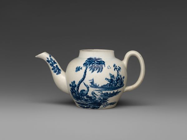 Editor: Here we have a lovely little earthenware teapot, dating from the early 18th century. The museum attributes it to an anonymous maker, and it's decorated with these very charming lotus scroll and ruyi patterns in blue. What can you tell me about the making and meaning of such an object? Curator: I think it is critical to acknowledge this teapot as a product of cultural exchange. Its material – earthenware – and painted decorations, demonstrate the commodification of artistic traditions through the act of cultural imitation and adaptation to market forces. Let's think about where and how the clay was sourced, how the pigments were made, who exactly designed these decorative motifs? Editor: So you’re emphasizing the globalized aspect? The piece is in the Rijksmuseum in the Netherlands… Was it made for export? Curator: Exactly. Who had access to this type of imported tea? Understanding the materials, the means of its production, the global trade networks at play, that’s crucial for situating an object like this historically. Who owned this teapot and what role did it play in their ritual of daily consumption? It certainly implies access to trade routes, doesn't it? What sort of economic power is materialized in the piece? Editor: I see your point. It’s not just a pretty thing; it’s about economic power and international exchange expressed through design and the process of production. Curator: Precisely. This wasn't created in a vacuum. It’s tangible evidence of material exchange and labor systems, all embodied in something as seemingly simple as a teapot. Editor: It’s fascinating to think of the teapot as part of global resource flows instead of just a display of craftsmanship! Thank you!