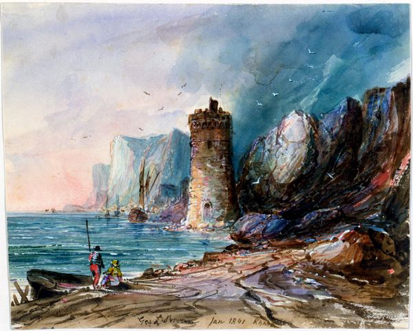 Curator: Immediately, the sheer drama of the sea grabs you, doesn't it? There's something almost theatrical about those churning waves. Editor: It’s tempestuous! You know, it actually brings to mind struggles against colonialism for self-determination, even though it's "just" a seascape. The might of nature… reminds us of the human scale. Curator: True, true. Well, what we’re looking at is "The Coast of Genoa," an oil on canvas painted in 1854 by Jasper Francis Cropsey. Editor: It has this quality, the dramatic romanticism you expect from the Hudson River School, right? That Hudson River state of mind, displaced onto the Italian coast! Curator: Absolutely. Cropsey travelled extensively, and he brought that distinctly American eye for grandeur with him. Look how the city climbs up the cliffs toward the lighthouse... Editor: And beyond that...are those the Alps in the background? Juxtaposing human civilization with that monumental geological timeframe creates such an interesting dialectic. Is it about permanence versus the ephemeral, maybe? I mean, civilizations rise and fall. Mountains…mostly stay put. Curator: Maybe. I get the sense he was chasing that sense of sublime power... It’s as if he wanted to capture the untamed spirit of this coastal landscape, and place human presence – and vulnerability -- within its grand sweep. He has us contemplating how small we really are. Editor: Right, like we’re grappling with concepts of nationhood and empire here too… considering Cropsey was painting at a moment of fervent American expansion, that almost violent growth... You see this image and you ask who really holds dominion. Is it us, with our quaint structures clinging to the cliffs? Or the uncontainable ocean? Curator: That contrast, the city huddled against that elemental force, that's pure Cropsey. Editor: I wonder what this painting would suggest for postcolonial audiences grappling with uneven power dynamics and climate crises... It strikes me, in that light, as way more pertinent than some pretty view. Curator: I like how we end up connecting the artist's soul-searching with today's challenges. It changes the way I will experience this picture now, definitely. Thanks. Editor: Thank you, art has no end! It continues to reveal something else about ourselves at every turn.