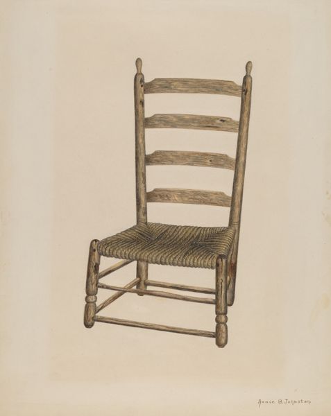 Curator: Look at this humble, graceful form, frozen in time! This is a pencil drawing simply titled "Chair" by Lee Brown, rendered around 1939. Editor: The first thing that strikes me is its stark isolation on the page. It really emphasizes the chair as a produced object, outside of any lived space. A real icon. Curator: Absolutely, and isn’t that a quiet power move? A drawing of a chair. It’s like stripping the concept down to its essence, daring us to truly consider something so utterly…banal. Editor: That “banality” is key. The focus is so much on the construction, the joints, the repetitive verticals—we're drawn into the industrial nature of furniture even in what looks like hand work. How many chairs like this were cranked out then? Who assembled them, and under what conditions? Curator: I love that reading, anchoring it to labor! And it sparks such tender images for me, thinking of someone carefully shading each rung. Doesn't it almost whisper stories of Depression-era craft and hopeful design? It also suggests a meditation on solitude—a single, empty chair. Awaiting its occupant…or abandoned? Editor: Solitude absolutely fits the material context too, especially if you imagine mass-produced furniture in small apartments. This design flattens the person occupying the chair. Curator: Good point! It brings into focus the very essence of this drawing – the power and beauty in simplicity, and that thoughtful isolation from the mess and rush of living. It's about quiet observation. Editor: I still get that undercurrent of tension, a visual memento mori through the industrial design. But thanks, your view of "quiet observation" balances that darker tone. It allows space for our individual stories with simple furniture. Curator: And in the end, maybe that's what great art achieves—offering a space where we can project our own reflections. Even on a seemingly ordinary chair. Editor: Well, Lee Brown certainly put forth a good challenge. Who knew so much thought could come from a single, simple "Chair"?