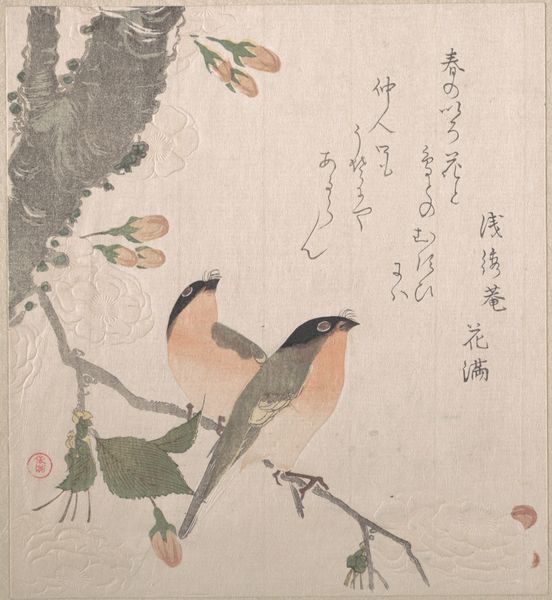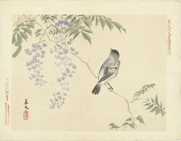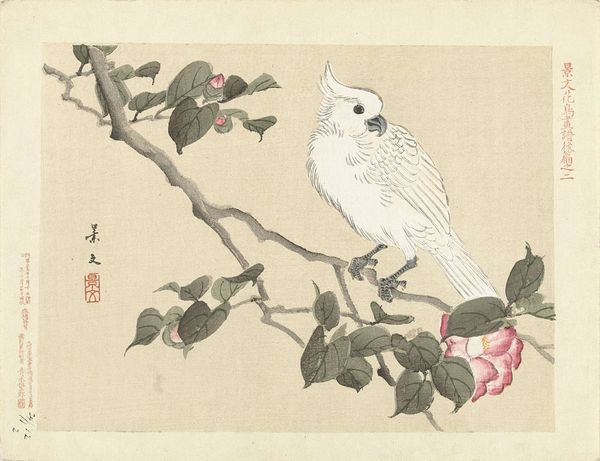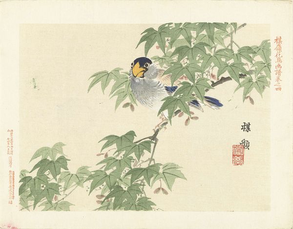 Curator: Welcome. Before us is “Zwart-rode vogel,” which translates to “Black-Red Bird," a watercolor work by Matsumura Keibun, dating from around 1892-1897. What strikes you about it? Editor: Immediately, I sense tranquility. The bird's poised stillness against the backdrop of verdant leaves evokes a quiet corner of nature. I’m drawn to the composition, a play between negative space and meticulously detailed elements. Curator: Yes, observe how Keibun’s deliberate arrangement creates a powerful sense of balance. The asymmetrical placement of the bird, anchored to a delicate branch, reveals his mastery of spatial relationships. There's an interesting tension at play. Editor: It's true; the contrast between the bird's sharp plumage—those bold blacks and reds—and the muted greens hints at deeper symbolic resonances. Birds in Asian art often signify freedom, messengers bridging realms. Does the juxtaposition of colors speak to something similar here? Curator: The stark chromatic division certainly invites symbolic reading. Black could be perceived as knowledge, but the vermillion implies vitality and passionate expression. He places complementary colors in perfect opposition which generates not chaos but harmony. Editor: And the subtle gradations within those colors—observe how the black feathers are not simply flat, but textured with delicate white markings. That invites the viewer into the painting on a microscopic level. It encourages an intimate connection. I am intrigued by the surrounding foliage; the leaves seem almost like delicate lace. Curator: The foliage surrounding the bird could suggest themes of seasonality and cyclical rebirth. Editor: The delicacy of the medium contrasts strikingly with the power suggested by those colors. Considering the date, how might this ukiyo-e subject reflect broader aesthetic trends of the time? Was the natural world of interest in particular ways? Curator: That's perceptive. Indeed, around the turn of the century, there was growing appreciation for pure landscapes and depictions of nature's beauty, influenced by wider trends of orientalism throughout Europe. This piece is a striking testament. Editor: It’s more than a mere pretty bird. There is an intense connection. The naturalism on view makes this quite extraordinary and powerful. Thank you, that has really given me a new appreciation of this composition. Curator: Likewise, contemplating the cultural and symbolic framework alongside its formal structure provides us deeper appreciation of this deceptively subtle work of art.