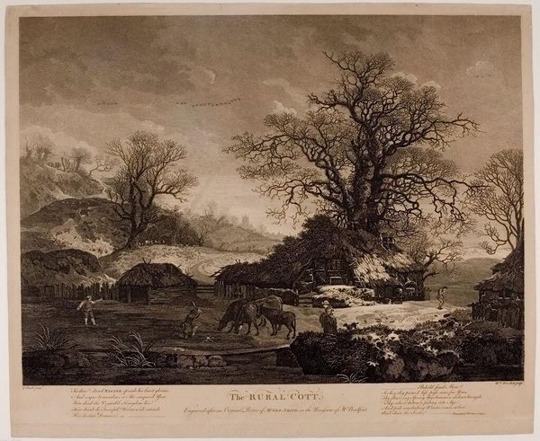 Curator: Ah, Zentner's "Peasant and His Dog Approaching a Large Barn." I find it so evocative. Editor: It gives me a sort of melancholy feeling, actually. It reminds me of fairy tales, you know, the slightly grim ones? Curator: Absolutely. The bare trees, the flock of birds overhead. Notice how the barn isn't just a building; it's almost a character, stoic, watching. The dog—a symbol of loyalty, right?—leading the way. Editor: Yes, and you can practically feel the weight of the peasant’s load, a classical symbol of burdens. Even the little birds feel symbolic, a hint of coming winter. Curator: It’s fascinating how Zentner uses the landscape to amplify the human condition. It’s not just a depiction of rural life; it's a meditation on resilience, and the cyclical nature of things. Editor: There's such a quiet dignity to it all. A reminder that even in the simplest of lives, there's a profound story unfolding.