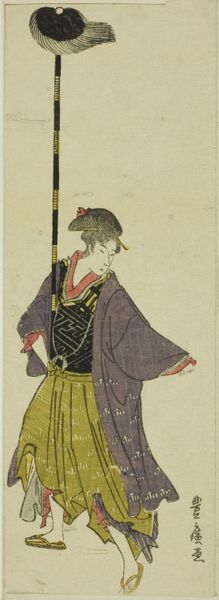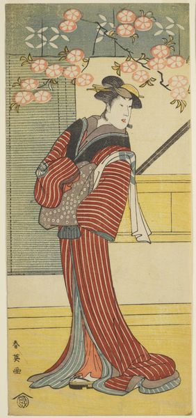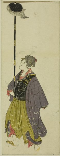 Curator: Let’s turn our attention to Katsukawa Shunko's woodblock print from around 1786-1787, entitled "The Actor Segawa Kikunojo III in an Unidentified Role," now residing here at the Art Institute of Chicago. The prints in the Ukiyo-e style captivate immediately, don’t they? Editor: It has a wonderful sense of understated grace, particularly in the soft coloring and the subtle textures created through the woodblock printing. You almost get a sense of quiet introspection emanating from the figure. Curator: Absolutely. Focusing on the print's construction, the key block determined the outlines, with subsequent blocks carefully carved for each color. Shunko utilized several blocks here—notice the way the green of the robe interplays with the darker, swirling pattern of the outer garment, creating a sumptuous interplay of material representation. Each application required meticulous labor, a collective endeavor by artisans dedicated to reproducing the master’s vision, reflecting the collaborative, yet stratified, nature of production in Edo period Japan. Editor: It speaks volumes about identity formation within the context of theater, doesn't it? We're looking at an actor, portraying an unknown female character—himself a gendered and raced performance. This Ukiyo-e print places that fluid performance in a space accessible for viewing and consuming by a broad audience. It invites us to contemplate the construction of gender, class, and celebrity in the 18th century through art, while also allowing a space for reflecting on how we perceive the identity of theatrical workers and what social expectations are for people within that creative, artistic space even today. Curator: Yes, consider the implications for consumption as well. The widespread production of these prints made theatrical figures more accessible than ever, essentially turning actors like Segawa Kikunojo III into commodities. They blurred the boundaries between art and popular culture. The materiality of the print – the paper, ink, and wood – facilitated this process of commodification, democratizing access while embedding it within circuits of trade and exchange. Editor: Indeed, and this consumption creates a dynamic. I think this piece creates room to interrogate historical narratives through a contemporary lens and discuss issues pertinent in theater, social justice, artistic consumption and performance in art. Curator: Very well said. What resonates most for me is Shunko’s exceptional rendering of fabric. One can almost feel the texture and weight, which is testament to his mastery of technique and the collaborative labor that underpinned it. Editor: Ultimately, what remains powerful about this print is how it transcends a simple record and invites conversation about gender and labour in the world of Japanese Theater.