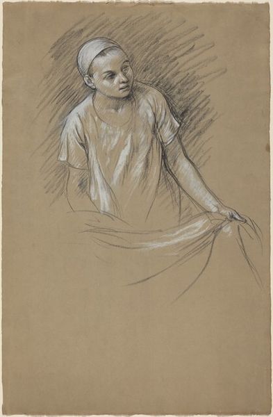 Curator: Before us we have "Child with Musical Instrument," a portrait drawing of unknown date by Thomas Barker, housed right here at the Art Institute of Chicago. It appears to be rendered in pencil on paper. Editor: It feels rather melancholic, doesn't it? The subdued tonality, the stark negative space... and is that a shawm he's holding? The line work is very suggestive but it is unclear, which adds a certain vulnerability to the figure. Curator: Precisely. The sketch-like quality, especially apparent in the child's drapery and hands, highlights Barker’s masterful use of line to capture not just form, but also a particular mood. Look at the almost rhythmic, parallel hatching creating shadow. Editor: Which speaks volumes, if you consider the material limitations Barker was likely operating under. Pencil and paper; relatively inexpensive and accessible materials. It suggests a certain urgency, perhaps a need to capture a fleeting moment in the child’s life or even the conditions of labor or access at the time. Was this meant to be a study for something larger or simply the act of sketching available to a sitter or location? Curator: It's interesting you raise that point. Consider the careful attention given to the child's face – a concentrated expression juxtaposed with the looser handling of the rest of the figure. The structural relationships create the effect. Is he pondering his note? Is it more conceptual than a true record? Editor: And how that musical instrument functions as a symbol here. The means to making it, its intended purpose, would reflect much about access to instruments in different times and places and different socio-economic backgrounds. Was it finely carved of precious material, or crudely assembled? A source of pleasure or one of income? A toy or a tool? Curator: The formal construction of the artwork emphasizes not only shape but also deeper artistic engagement with his subject. Note the slight asymmetry and the implied triangle the face and instrument create, framing that delicate moment of musical involvement. Editor: This piece feels more resonant now after considering the raw materials used to make this drawing alongside the image's subject: a moment captured that likely points toward the social factors impacting a young subject. Curator: It does, yes. Through an analytical reading, we unveil not only the technique, but, the artwork invites contemplation of time and affect in this sensitive composition.