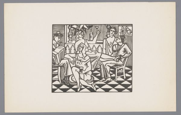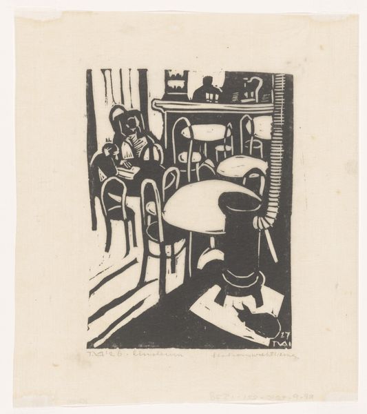 Ernst Ludwig Kirchner created this etching, titled "Interieur mit Menschen," sometime during his career. The stark black lines carve out a scene dominated by a claustrophobic interior and distorted figures, evoking a sense of unease. The artist's expressionist style is immediately apparent in the angular lines that define the figures and space. We can observe how the composition, lacking a clear focal point, scatters our gaze across the tableau. The figures, seemingly caught in isolated activities, are rendered with an almost brutal honesty. They are trapped in a domestic setting, yet there is an evident disconnect, a fracturing of relationships echoed in the fractured space they occupy. The etching technique itself is crucial here. The raw, almost aggressive lines amplify the emotional intensity of the scene, mirroring the anxieties of early 20th-century life. Kirchner uses the materiality of the print to convey a psychological state, transforming the domestic interior into a space of alienation. The effect is not just aesthetic but a profound commentary on human relations.