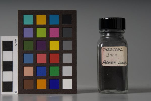Editor: This photograph captures "Blue Black" pigment from Winsor & Newton. The composition is striking, contrasting the vibrant color chart against the muted jar of pigment. What do you see in this piece? Curator: The photograph presents a compelling study of color and material. The grid provides a structured, almost scientific, counterpoint to the organic form of the pigment within the glass. Note how the cool tones of the pigment subtly echo and disrupt the systematic arrangement of the color chart. Editor: That's fascinating! I hadn't considered how the pigment interacts with the chart's cool tones. Curator: Precisely. This tension between order and irregularity, between the manufactured and the material, is central to the work's visual impact. A deeper appreciation emerges when you observe the work's components in relation to the other. Editor: I understand now! Thank you for pointing that out.