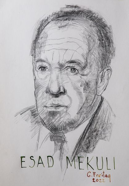 Gazmend Freitag created this pencil drawing, "Shaqir Foniqi," in 2014. The portrait captures the subject's face head-on, his gaze holding a directness that invites scrutiny, his neutral expression concealing more than it reveals. Consider the human face itself: it is a stage upon which life's dramas are etched. Each line, each contour tells a story, echoing the classical tradition of physiognomy where one attempted to read character through facial features. Think of the Roman busts, or even da Vinci’s sketches – attempts to capture not just likeness but essence. The face becomes a mask, a symbol of identity both personal and universal, and like all symbols, it evolves. What the artist chooses to emphasize—or conceal—speaks volumes. This very act, seen across eras, touches on our collective memory, a subconscious recognition that ties us to the past. This face, rendered in delicate strokes, invites us to look deeper, beyond the surface, into the timeless mystery of human existence.