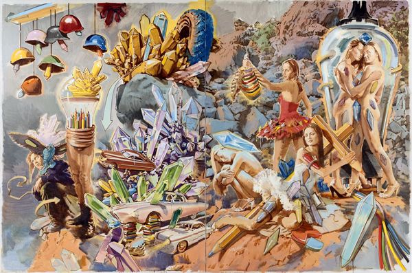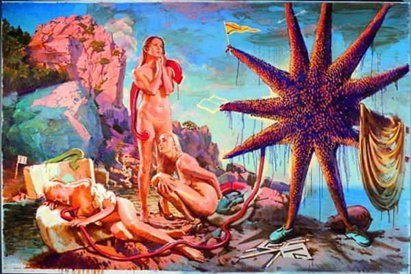 Arsen Savadov made 'Escape to Egypt' as a kind of maximalist fantasia, seemingly without a specific date, and the riot of images and symbols just pours out. It's like a painterly stream of consciousness. Look at the way the figures are built up with these loose, almost frantic brushstrokes. You can almost feel Savadov's hand moving across the canvas, layering color upon color. The paint is applied in such a way that the texture becomes as important as the image itself. Notice the details, like how the light hits the figures' skin, or the way the foliage is rendered with these quick, dab-like marks. There's this wonderful tension between representation and abstraction, where the subject matter dissolves into a sea of pure paint. The overall effect reminds me a bit of James Ensor's work, with its crowded compositions and grotesque imagery. Both artists seem to revel in chaos, embracing ambiguity and multiple interpretations rather than striving for some kind of fixed meaning.