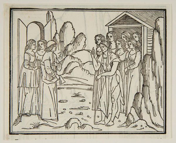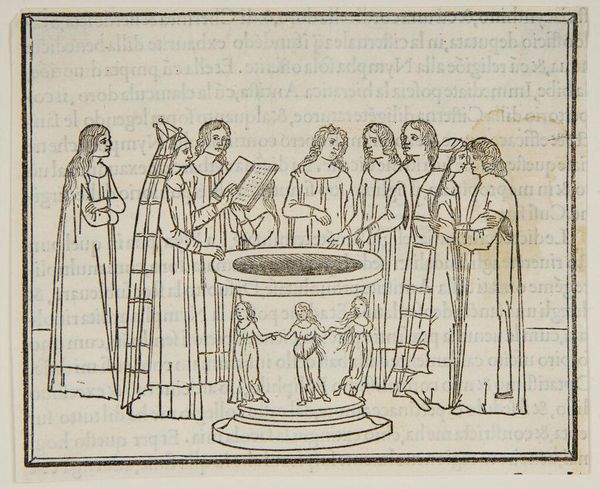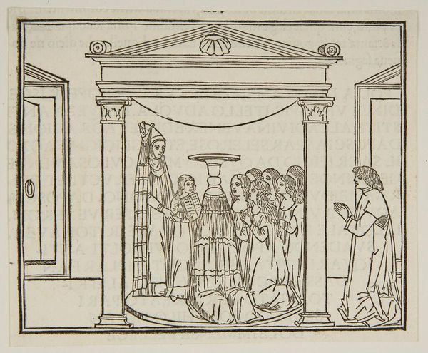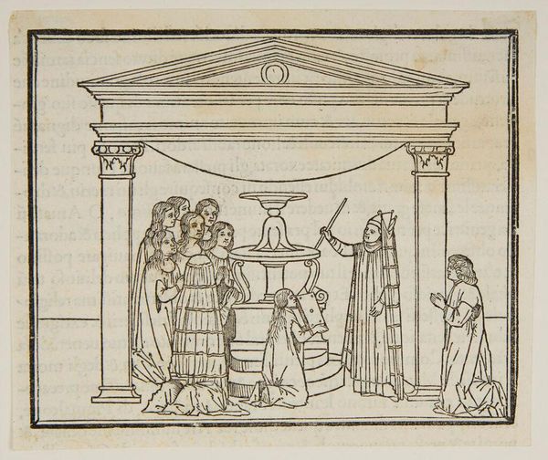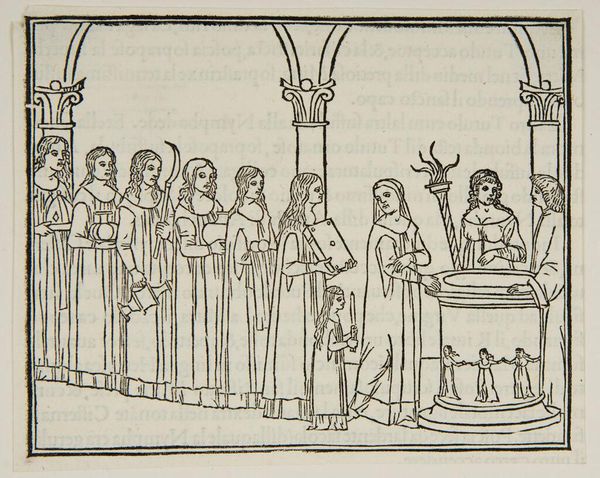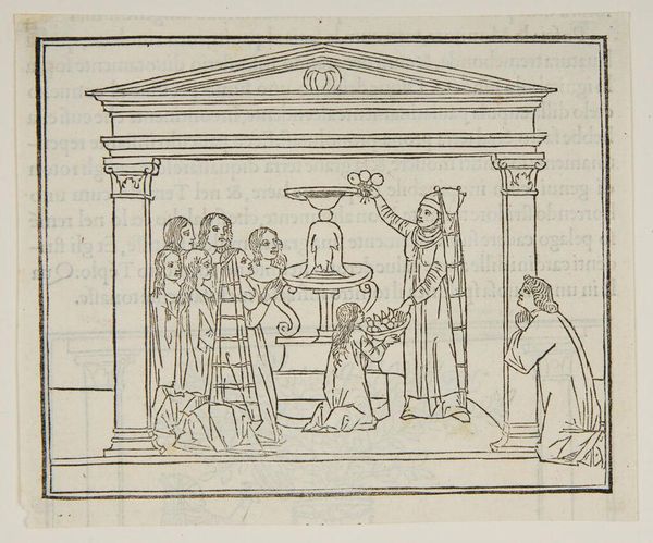 Editor: This is "Continuation of the Ceremony in the Temple of Venus," an anonymous work. It depicts a ritual, I think. What symbols stand out to you in this image? Curator: The temple setting itself is heavy with significance, suggesting the enduring power of classical ideals. And note the fruit: throughout history, it is charged with symbolic weight, fertility, temptation, and knowledge. Does the fruit's presentation change its meaning for you? Editor: It does. It adds a layer of reverence. So, it's not just about temptation, but also sacred offering. Curator: Precisely. The high priestess and the supplicants, combined with the fruit, evoke timeless cycles of life, death, and renewal. Editor: It’s amazing how much meaning can be packed into seemingly simple images. Curator: Indeed, a potent reminder of how images communicate across generations.