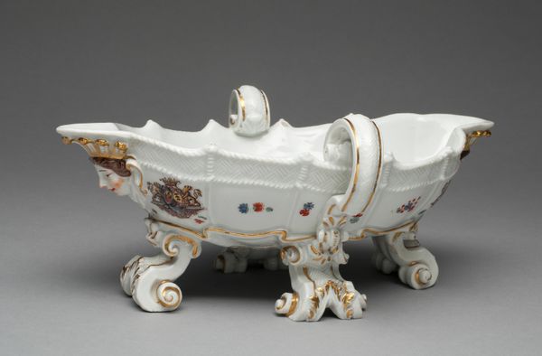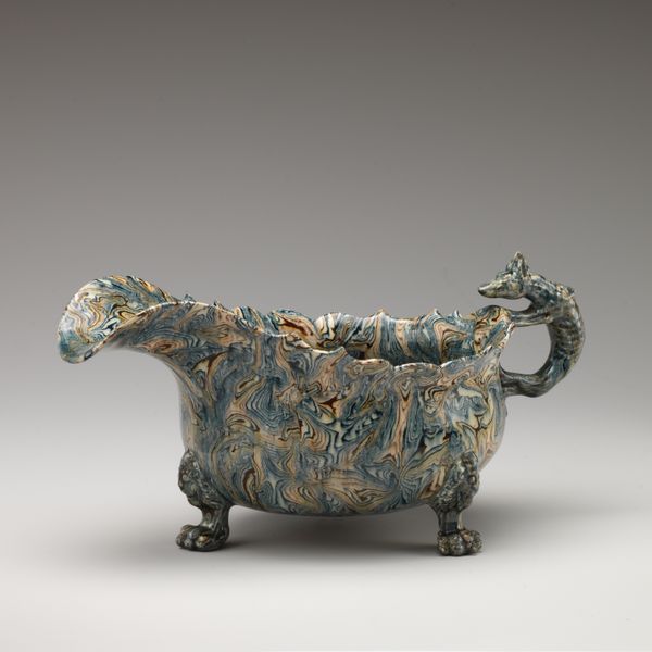 This whimsical sauceboat was crafted by Ralph Wood the Younger in the 18th century from earthenware. In a period of burgeoning social stratification, the sauceboat reflects the era's complex relationship with nature and dining. The boar's head design connects to a long history of hunting and feasting rituals, a practice deeply entwined with class identity and power. The boar, rendered in rich brown glaze, emerges from a base of green foliage, its mouth agape. The handle is formed by a stylized swan, its neck arching gracefully, feathers and head painted with cobalt blue. This piece sits at the intersection of utility and representation, reflecting societal values and hierarchies. What emotions are evoked when the symbols of wilderness and status converge? The sauceboat encourages us to consider the narratives that objects can convey, and invites reflection on our relationship with them.