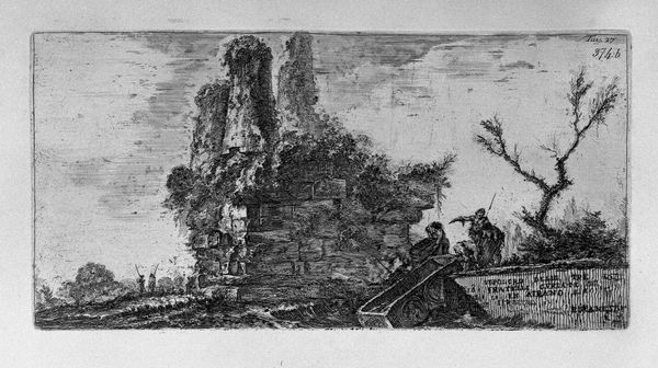 Curator: This is a fascinating piece from Giovanni Battista Piranesi, titled "The Roman Antiquities, t. 3, Plate XIV. View of a tomb outside Porta del Popolo on the ancient Via Cassia called by the vulgar: the tomb of Nero." It's a print, using etching and engraving techniques, showcasing a tomb from antiquity. Editor: It’s so dramatic! The light and shadow create such a sense of foreboding. It feels both majestic and deeply melancholic. Curator: Piranesi was known for these dramatic perspectives and romanticized views of Roman ruins. This work really embodies the Neoclassical fascination with the past, but with a distinct Piranesian flair. Look how the figures are dwarfed by the architecture. What’s that suggesting, historically? Editor: Right, it plays with scale, doesn't it? It diminishes the contemporary figures to highlight the monumentality – and perhaps the faded glory – of the Roman Empire. The “tomb of Nero,” regardless of whether it *actually* is his, operates as a powerful symbol of power, death, and the cyclical nature of history. I'm struck by the idea that this supposed symbol of Nero could be seen in a popular way "by the vulgar," as the artist himself indicated. What statement about class differences or public opinion does the artist try to make by capturing that specific viewpoint? Curator: Indeed! We see these recurring themes reflected across Piranesi’s work as he investigates the social and cultural history through prints such as this. Editor: Absolutely. The decay is so palpable, it’s hard not to see it as a commentary on the impermanence of even the grandest empires. I'm really fascinated with the political implications: How the visual representation of the fall of power operates as a constant reminder of the ever-changing sociopolitical context. Who benefits, who doesn't and how do these kinds of work function as either propaganda or warning in modern societies? Curator: Piranesi's work also challenges our notions of accuracy and representation. He was known to exaggerate details, play with perspective, so that these works themselves function almost like theoretical statements about civic architecture and the role of power, especially in 18th century Rome. Editor: Yes, precisely! He’s not just documenting, he’s constructing a narrative, which, in the end, raises some exciting ideas for future historical exploration. Curator: Thinking about this today helps reveal those layered historical contexts. Editor: It does. It pushes me to question who benefits and who is oppressed through art.