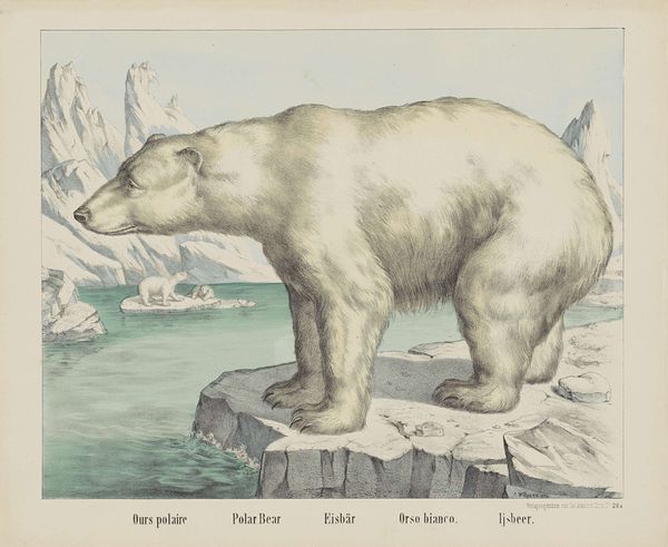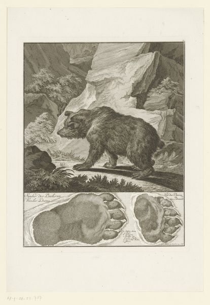 This print depicting a bear is by firma Joseph Scholz. The image presents a rich study in contrasts. The bear, rendered in deep browns and blacks, stands out against the lighter background, which is a serene landscape of grays and muted greens. Note how the artist uses linear hatching to define the animal's fur, creating a sense of volume and texture. This meticulous attention to detail extends to the environment, where the rocks and foliage are similarly defined. What we see here is not just a representation of nature, but a carefully constructed composition. The layering of foreground and background, the interplay of light and shadow, and the textural contrasts all work together to create a dynamic visual experience. The artwork invites us to consider how it constructs our understanding of nature. The representation of the animal engages with both its physical presence and the idea of wildness. This bear embodies a set of visual codes that communicate ideas about nature and our place within it. How does this image unsettle fixed ideas about nature and representation? How do we read the landscape in relation to the figure? I encourage you to consider these questions as you explore the exhibit.
