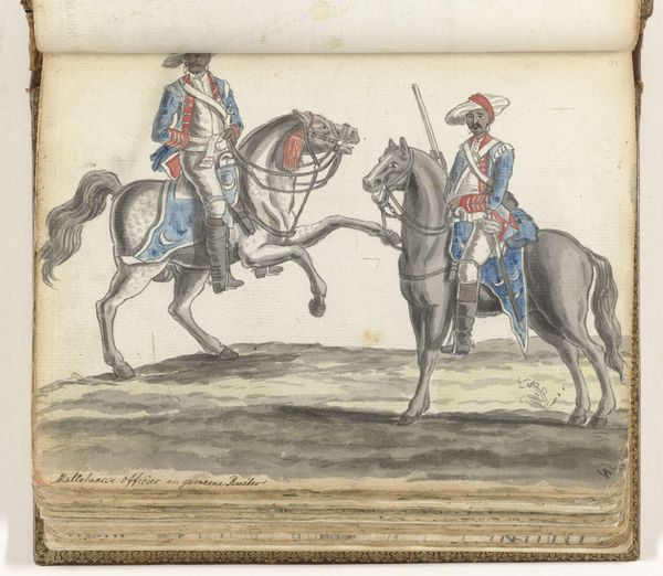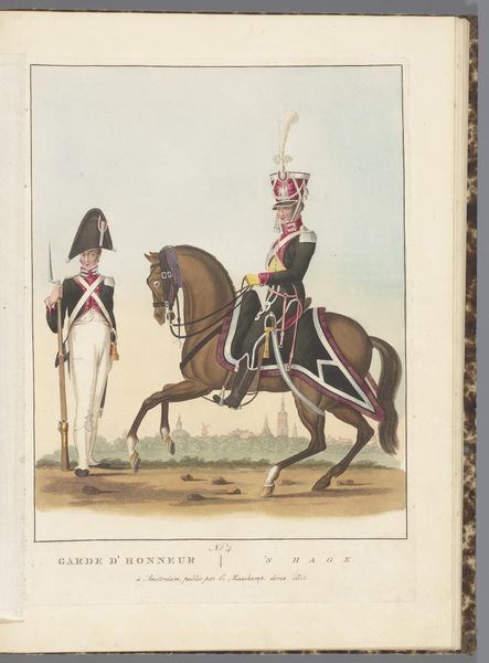 Curator: Jacob Coldewijn created this engraving, entitled "Schutterij / te paard en te voet," sometime between 1827 and 1894. It's currently held here at the Rijksmuseum. Editor: My initial reaction is how crisp and almost diagrammatic it feels. The lines are so clean and the colors are restrained. The composition has a remarkable balance; however, its schematic layout almost renders the characters as if devoid of an inner world. Curator: Observe how Coldewijn used line and subtle variations in tone to define form. Consider, especially, the cross-hatching which builds volume, particularly noticeable on the horse. Notice the almost naive symmetry to both characters portrayed on either side of the work. What structural choices, in your opinion, enhance or detract from its effectiveness? Editor: The uniforms strike me, actually. These men are literally armored in signifiers, coded to communicate status and role. The colors – particularly that almost ultramarine blue – evoke feelings of pride and allegiance. I see echoes of grand military traditions embedded in those outfits and accoutrements. What do you suppose these specific visual emblems meant to the people of that time? Curator: Undoubtedly, they functioned as very potent indicators. Consider the way in which they echo the broader Romantic movement and a revival of national pride in the early to mid-19th century, using color and sartorial code to signify rank, purpose, and place in society. Editor: Beyond simple pride, could there be an element of yearning or even anxiety in these rigidly depicted figures? They almost seem to cling to the visual cues of power and purpose as a way to stave off societal anxieties. After all, symbols do not merely communicate; they reassure. Curator: A valuable counterpoint. The very formalism of Coldewijn's rendering could be seen as both a celebration of and, subtly, a questioning of established social structures through the artifice and strict control inherent in the artistic representation itself. Editor: Ultimately, it serves as a meditation on how communities invent and reinforce ideas of belonging. Curator: A perspective with which I can only wholeheartedly concur.