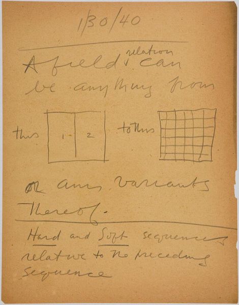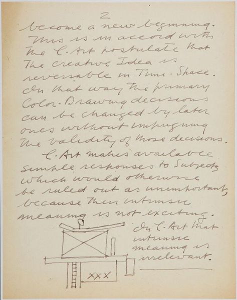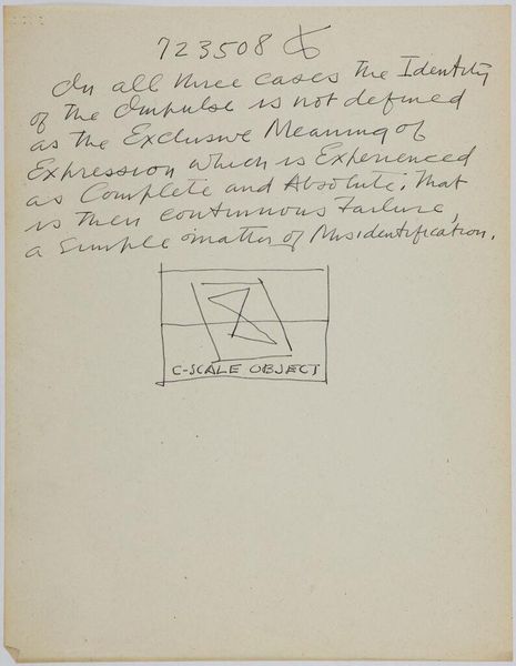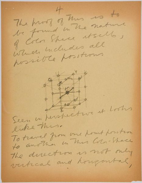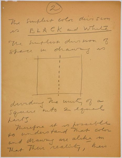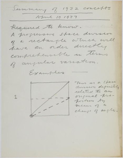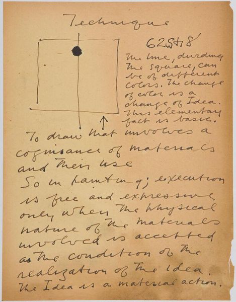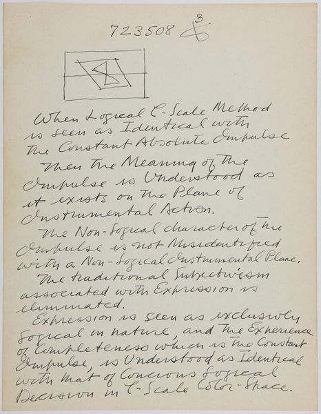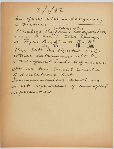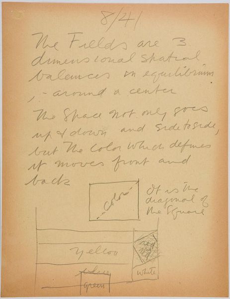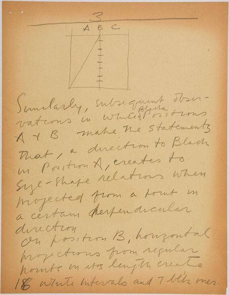 Editor: Here we have Stuart Davis’s "Art Theory Text with Color-Space Diagrams." The hand-written text and simple diagram feel very immediate. What do you see in this piece? Curator: It’s interesting to consider this in terms of Davis's broader artistic practice. The materiality here—paper, ink, the act of writing and drawing—reveals the artist's conceptual process. Davis seems to be dissecting the very foundations of how we perceive color relationships and how they are constructed. What does it suggest about artistic labor? Editor: It's fascinating to think about how he's breaking down the act of seeing into its component parts. I hadn't considered the labor involved. Thanks!