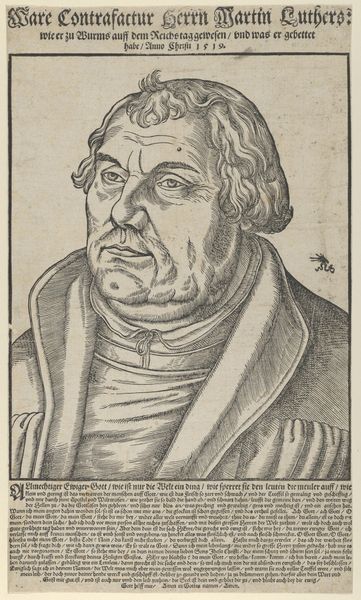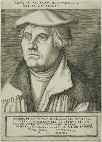 Curator: Welcome. We're standing before "Portret van Martin Luther," an engraving created sometime between 1565 and 1611 by Paulus van Wtewael. My initial reaction is the starkness of the light, a chiaroscuro effect typical of the Northern Renaissance. The starkness almost accentuates Luther’s prominent features. Editor: It's striking, yes, in its visual impact. I’m immediately thinking about the printing process here. The density of line work suggests an artisan who painstakingly rendered each mark. Was it printed from a copper plate perhaps? One thinks about the labour behind producing multiples, disseminating the image of Luther widely. Curator: Indeed, it's the deliberate composition which commands attention. The artist utilizes the graphic nature of the engraving to define texture. Notice the contrast of the curls in his hair compared to the austere lines of his robe. Semiotics point us to reading that opposition: the earthy man versus the man of God. Editor: Good observation. However, it leads me to considering the socioeconomic context. Engravings like this had power beyond aesthetics, disseminating ideas rapidly, cheaply. And it raises interesting questions of patronage. Who commissioned this? For what purpose was this mass-produced portrait of the reformer made available? Curator: Agreed, the question of patronage adds a rich layer of understanding. Consider the inscriptions too, around the image. There's the birth and death information presented inside a heart-shape and below, two stanzas. Editor: The texts emphasize the creation of community via consumption: "Dat machonen blefen in mijn leuen,"—or "That must blossom in my life." Consider how powerful it would be, for someone of the reformation to encounter this image! The act of possessing this small material image connects them not just with Luther, but the act of creating change. Curator: It highlights the subject's gravitas. The face is almost like a landscape etched into the material itself. He has presence that echoes across time. It’s more than just a record; it's a construction. Editor: Absolutely. These prints played an integral role in shaping the cultural landscape of their time, far beyond mere representations of historical figures. They are remnants of socio-religious identity. Curator: Looking at this engraving allows us a potent insight, providing both visual complexity, and insight into cultural dissemination and individual identity. Editor: And underscores the capacity of art to not only reflect an age but shape the lives of the individuals embedded within it.