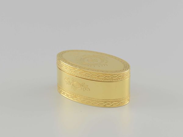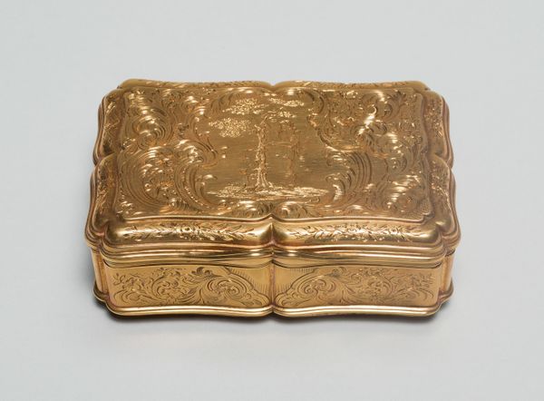 This delicate snuffbox was crafted by Michel Robert Hallé. The gold material radiates a rich, warm glow, inviting us to examine its intricate details. Notice the interplay between the box's structured form and its detailed ornamentation. Hallé contrasted flat planes etched with diagonal lines against the delicate floral reliefs around the edges. The cover features a scene of figures among foliage, adding to the box’s narrative complexity. The linear hatch marks create a sense of texture, while the floral patterns soften the rigid geometry of the box, merging naturalistic and geometric forms. This tension between structure and detail invites contemplation. It illustrates a dialogue between art and nature and evokes a world of sensory experiences, inviting us to reflect on the intersection of luxury, art, and daily life.