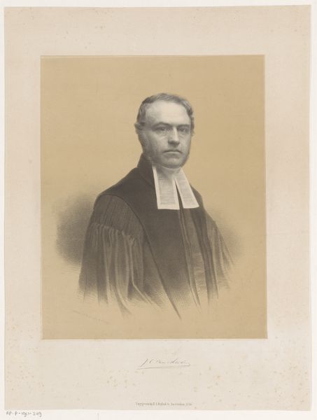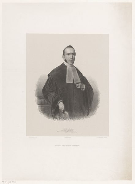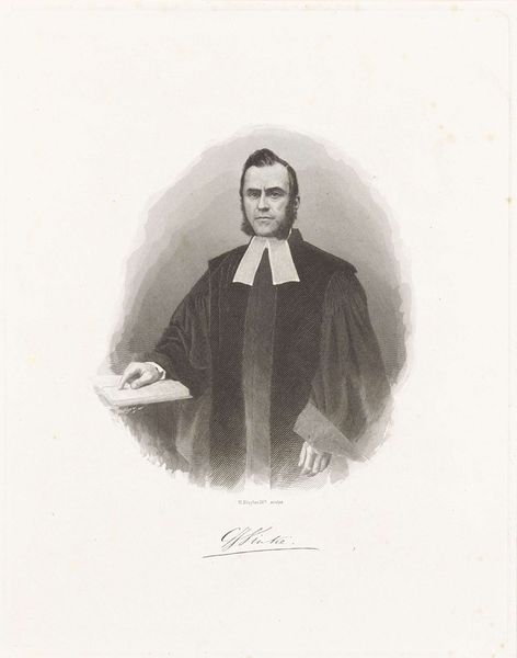 This is a portrait of Carel Steven Adama van Scheltema, made by Bernardus Theodorus van Loo in the 19th century. It's an engraving, meaning the artist would have used a sharp tool called a burin to carve lines into a metal plate, which was then inked and printed onto paper. Engraving was a highly skilled, labor-intensive process, demanding precision and control. Look at the fine details: the delicate lines creating shadows on the face and the intricate folds of the robe. The very act of making this image—translating a three-dimensional person into a two-dimensional representation through careful handwork—speaks to the value placed on craftsmanship and attention to detail in the 19th century. Consider how this differs from a quick photograph. An engraved portrait was an investment, signifying the sitter's status and the engraver's skill. By appreciating the process, we can understand the social and cultural significance embedded within this seemingly simple image, highlighting the artistry and labor involved in its creation.