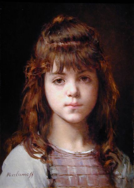 Curator: Ah, Alexei Harlamoff’s “The Young Model.” I find her so luminous. What do you see? Editor: Initially, I’m struck by this delicate vulnerability. It feels very posed, very much within the conventions of its time. But those eyes… they hold a certain knowing, a slight challenge to the viewer. Curator: Exactly! Harlamoff had a knack for capturing the ephemeral quality of youth. Her gaze follows me. The wisps of hair, the slightly parted lips – all give the sense that she's alive and about to speak. It's almost a reverie. Editor: But what does it mean to present female youth in this way? The heavy romanticism – doesn’t it flatten her into a mere object of beauty? Who gets to gaze here, and what are the power dynamics at play? Curator: It’s true, Harlamoff wasn't exactly subverting societal norms. Yet there's an innocence he preserves with such tenderness. I am always so taken with his rendering of the face, especially the lighting, in a soft halo. Look how it warms the features, bringing the face alive from the canvas. Editor: The details in the lacy fabric are incredible and speak to an elevated social standing. That is no coincidence. I wonder how much agency she, as the model, actually had. These images shaped societal expectations of young women, so the lack of control is a crucial part of the story. Curator: Yes, we must remember the historical context. I suppose that duality is what I find so fascinating here: the surface sweetness versus those unnervingly knowing eyes. I find myself asking many questions, always. Editor: Precisely. Art like this offers us a mirror to our own preconceptions, even if we find ourselves unsettled by what's reflected back. The aesthetic and the politics of seeing are forever intertwined. Curator: Well said! It definitely gives you a lot to mull over. I am walking away pondering much more than I bargained for today. Editor: It's that friction between beauty and the underlying social realities that keeps these works so potent, even centuries later. A powerful combination that leaves a resonating unease and unanswered questions lingering behind.