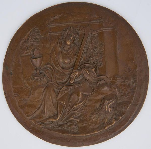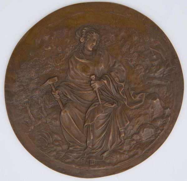 Curator: There's a distinct sense of melancholy conveyed in this relief. The lone figure seems burdened, almost crushed by the weight of the composition. Editor: This bronze roundel, titled "The Beggar, from the series 'Bacchus and the Consequences of Drunkenness'," currently held at the Harvard Art Museums, offers a glimpse into the social conditions that might lead to such despair. Curator: Indeed, the very materiality of the bronze lends a somber tone. It’s interesting how the unknown artist uses the medium to depict the effects of labor and its potential for exploitation. Editor: Note how the artist manipulates light and shadow to emphasize the beggar’s hunched posture and the dilapidated structures in the background, creating a visual narrative of hardship. Curator: Precisely. It makes you consider the resources required to produce art even about poverty. Editor: Reflecting on this artwork, we see how artistic expression can both embody and critique social realities. Curator: A poignant reminder that art often illuminates the complex relationship between creation and consumption.