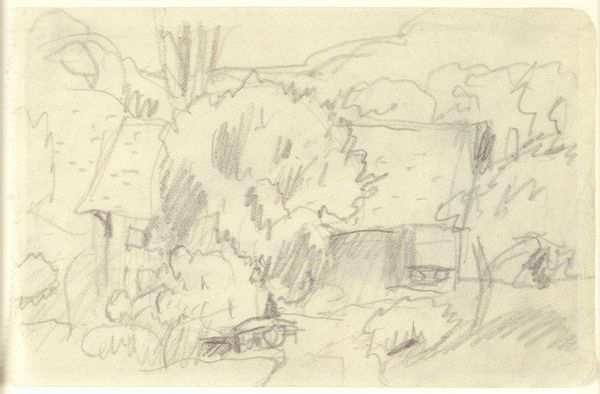 Editor: This drawing, "View of House by Waterfall and Stream" by Henry Ward Ranger, dates from 1858 to 1916. It’s a simple pen and pencil sketch, and it feels very…contained, almost like a secret world. What catches your eye when you look at it? Curator: The sketch's seeming simplicity belies its engagement with debates around American identity and artistic independence in the late 19th century. Consider the role of the waterfall and stream, recurring motifs in American landscape painting. Ranger presents them not as symbols of sublime wilderness – a la the Hudson River School – but domesticates them, almost renders them as picturesque backdrop to daily life. Do you notice how the house becomes central, framed by the nature around it? Editor: Yes, it's like the house is the main character! So, is Ranger making a statement about American settlement and our relationship with nature? Curator: Precisely! This piece prompts questions about the relationship between American artists and European traditions. Ranger, by the later part of his life, advocated for an explicitly "American" art. Is he, in this sketch, exploring how settlement and cultivation change our perception of the land? Think about the institutions that shaped artistic tastes at the time – the rise of museums, art academies – and how artists navigated these forces. Editor: So the ‘Americanness’ of the art wasn’t just about *what* was depicted, but *how* it was depicted and even *who* got to decide what "American" art meant? Curator: Exactly. It’s a question of cultural and artistic authority. This seemingly quiet sketch participates in those discussions. What do you make of Ranger choosing this intimate, sketchy style versus the grandiose paintings typical of the period? Editor: I see it as a deliberate choice. It's like he's saying, "This quiet corner of America is just as worthy of artistic attention." I’ll definitely look at these types of landscape art with a new perspective moving forward. Curator: And I'm reminded of how vital close looking can be for uncovering these historical dialogues!