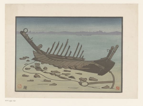 Curator: Here we have Ohara Koson’s "Vissersboten," a woodblock print from sometime between 1900 and 1936, currently residing in the Rijksmuseum. It depicts several fishing boats silhouetted against a hazy sky and sea. Editor: It’s quite muted, isn’t it? A dreamy scene. The repetitive vertical lines of the masts and reeds create a calming, almost hypnotic effect. I immediately think of quiet mornings and the routines of maritime labor. Curator: Exactly, the artist's use of the ukiyo-e tradition, emphasizes not just aesthetic beauty, but also the lives of commoners, in this instance, fishermen. Considering it's a print, the level of detail on those boats is astonishing; you can almost feel the texture of the sails. Editor: I'm struck by the sails themselves. They dominate the composition. Dark and looming, they seem to symbolize more than just the tools of labor; they evoke a sense of the unknown, the ever-present danger of the sea, and the constant reliance on natural forces. Curator: Ukiyo-e prints were not created by a single artisan, but by the cooperation of a designer, carver, printer, and publisher, a true testament to collaborative work. I’m also interested in the context; during this period, Japan was rapidly industrializing, yet here is a focus on the traditional trades and ways of living being disrupted by the advent of more industrialized methods. Editor: I hadn't considered that. Perhaps the hazy quality further reinforces this sense of the fleeting nature of a particular historical moment, the melancholic beauty of a world on the cusp of transformation. Curator: Absolutely. The reflection of light on the water could symbolize hope, or the reflection could also represent illusion. Editor: An interesting blend of concrete detail and symbolic weight, expertly achieved through the woodblock medium. I found a story here that engages both with tangible working conditions of a traditional industry, and the broader psychological themes of the sea, history, and memory. Curator: Indeed, this work exemplifies the importance of acknowledging the intersection of both tangible means of material and labor and cultural context.