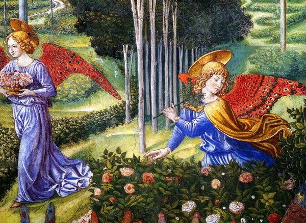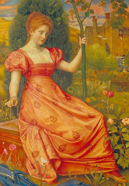 Editor: Eleanor Fortescue-Brickdale's watercolor and gouache painting, "A rose as fair as ever saw the North," created in 1920, strikes me as portraying a very tranquil scene, almost dreamlike in its clarity. The young woman seems lost in her thoughts amidst such lovely scenery. What symbols and visual elements jump out at you in this artwork? Curator: Well, the rose itself is a loaded symbol. Historically, across numerous cultures, it’s signified love, beauty, and sometimes, mourning. Brickdale, I believe, is playing on that inherent duality. It’s about transient beauty, the ephemerality of youth reflected in that single bloom. Editor: The title alludes to that fragility too, doesn't it? But what about the setting itself, the pastoral landscape? Curator: Yes, the landscape is integral. Notice how the open book suggests learning, knowledge. It could also mean this is a moment of pause before the subject returns to her book. The backdrop of grazing sheep indicates a peaceful, perhaps idealized, vision of rural life, of innocence and a prelapsarian world, distanced from the rapidly industrializing cities. How do you interpret her contemplative pose? Editor: She appears calm and slightly melancholic. Perhaps she is pondering something she has read, some difficult emotion. Curator: Indeed, that interplay between the idealized landscape and her inward gaze makes it a powerful study of internal versus external worlds. Brickdale cleverly juxtaposes external beauty and personal introspection. Editor: It's fascinating how a single rose and a pastoral setting can speak volumes about memory and personal reflection. Thank you for illuminating the layers of symbolism. Curator: My pleasure. Discovering these cultural resonances allows us a richer encounter with any work of art.