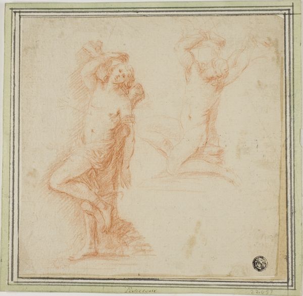 Curator: At first glance, this drawing evokes a sense of serene elevation, the delicate lines imparting an ethereal quality. Editor: Precisely! Let's delve into Sebastiano Conca's "Angel with Putti Carrying Object." Although undated, the drawing offers a lens into the artistic and social conventions regarding idealized beauty during its era. Consider how the putti, as representations of innocence, were utilized by those in power to frame the concept of a divinely sanctioned status quo. Curator: A compelling observation. The central angel's features adhere to classicizing ideals, recalling figures in earlier Renaissance art. Note the prominence of the drapery—an intriguing stylistic feature often symbolic of virtue or revelation. But who does that virtue serve, and what are the implications of that representation? Editor: The symbol itself might be multivalent. This work seems less concerned with promoting piety. Observe the softness of the line work. There is nothing dogmatic or militant here; rather, it hints at something hopeful and inspiring. This is reinforced by the object carried by the putti. While the purpose of this symbol is now opaque, we can trace similar icons back millennia. Curator: This all underscores the intersection of faith and power, art used to reinforce hierarchical structures within society. Do you see parallels between these figures and, say, more recent symbolic uses of angels in propaganda? The composition subtly but undeniably posits an ideal that’s not just spiritual, but sociopolitical. Editor: Well, I see it slightly differently. I acknowledge the inherent risk that images can be appropriated. But looking at this work, I still discern a sensitivity, a glimmer of something beautiful transcending these contextual limitations. Perhaps the softness of the chalk resists a complete surrender to ideological exploitation. Curator: It is a good point that images and their symbols may live on. Understanding art means appreciating not just the artist's hand, but also the historical forces that shaped its making. This artwork prompts us to think about how cultural narratives evolve. Editor: Yes, ultimately the angel and putti remain potent symbols that have transformed across many eras of representation. Hopefully, continuing dialogue like this makes viewers consider and discover deeper meanings.