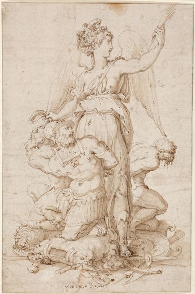 Editor: Here we have Bartolomeo Neroni’s “Sibyl Announcing the Birth of Christ to the Emperor Augustus,” a drawing dating between 1505 and 1571. It’s an ink drawing on toned paper. I'm struck by the dynamism of the figures, but also the somewhat sketch-like quality. What do you see in this piece, considering the artist’s technique? Curator: Formally, the drawing showcases a confident application of line and wash to create depth and movement. Note how the artist uses hatching and cross-hatching to build up the tonal values, especially in the figures of Augustus and the Sibyl. The architectural background provides a structured counterpoint to the animated figures in the foreground, which calls attention to the figure composition. Have you noticed the positioning of the Virgin and Child? Editor: Yes, they seem almost like a vision hovering above. It makes the Sibyl's announcement feel more supernatural, contrasting against the Emperor's physical presence. Curator: Precisely! This juxtaposition emphasizes the contrast between the earthly realm and the divine. The medium—ink on paper—allows for both delicate detail and broad expressive strokes, which you can appreciate when viewing it in person. The lines of the figures at the left feel smoother than the more nervous handling of the lines indicating the Emperor's subjects. The materiality contributes significantly to the overall effect. The warm tone of the paper acts as a unifying element, further enhancing the visual harmony. It also serves to lift the tonal contrast. Editor: That's a fascinating point. The tone of the paper creates a balance across the artwork. I've never thought about toned paper having such an effect! Curator: Examining such aspects offers insight into the artist's intentional use of formal elements to construct meaning. The piece rewards close observation, revealing how the interplay of line, tone, and composition can convey complex narratives. Editor: Absolutely, seeing how the technique and materials directly affect the viewing experience is eye-opening. Thanks for your formalist insights.