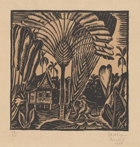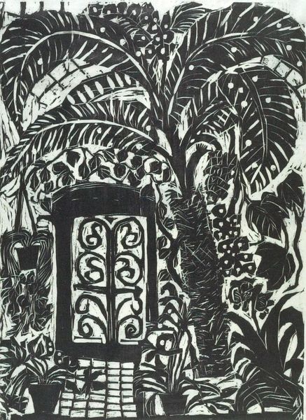 Curator: This is "Conservatory I" by Matsubara Naoko, part of the collection at the Harvard Art Museums. It measures about 39 by 29 centimeters. Editor: My first thought is this feels almost claustrophobic, yet vibrant. Like a secret garden overflowing its boundaries. Curator: Naoko’s use of the woodcut medium creates a striking contrast, playing with light and shadow within this dense, botanical scene. Editor: Exactly! The deep blacks carve out these almost rhythmic patterns. I keep searching for a hidden creature, a lost gaze. Curator: Considering Naoko’s broader body of work, this print echoes themes of nature reclaiming urban spaces. The conservatory becomes both refuge and symbol. Editor: Perhaps a reminder that even within structured spaces, life finds a way to burst forth, messy and beautiful. It makes me think of childhood adventures. Curator: It's a compelling tension, and the print invites us to consider the ongoing negotiation between nature and culture. Editor: Absolutely. It's a reminder that wildness persists, even when framed.