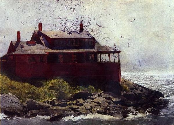 Curator: The intensity of this primary color! It’s almost aggressive, yet contained within the relatively small dimensions of "The Red House of Monhegan" by Dan Graziano. Editor: Aggressive is a great descriptor. The thickness of the oil paint combined with the strong color evokes a feeling of a raw, almost elemental force. It's pure energy solidified, isn’t it? Curator: Absolutely, and I think that elemental quality speaks volumes about the social context. Consider Monhegan Island itself, historically a hub for artists drawn to its isolation and raw beauty. The "plein-air" technique only heightens the intimacy with place. Was that intimacy, though, afforded equally to all? Who gets to access this artistic experience, to live and work on this island? Editor: An important point. In terms of materials, look at how Graziano used relatively simple oil paints to depict what seems like an utterly unglamorous, though solid, structure. The paint application mirrors the building’s steadfastness against the coastal elements. It's labor manifested through the materials and depicts, in my view, a very American kind of ruggedness and self-reliance. Curator: Yes, but the vibrant red challenges any simple notion of “ruggedness”. It calls attention to itself, demanding we acknowledge its presence within this austere landscape. This boldness feels almost like a radical act of claiming space, doesn't it? I’m compelled to examine questions of ownership and land use. How might local histories be revealed by this "occupation" of color? Editor: It's hard to ignore the role of consumerism, however. I read this boldness differently—less radical claim, more straightforward product placement! Even painted as loosely as it is in this almost impressionistic way, we can still clearly read "house," which can readily be interpreted as commodity. Curator: Perhaps. I tend to see more yearning and vulnerability. Thanks for revealing the capitalist framework with which the painting is complicit. I’m compelled by that tension—the vulnerability of dwelling versus capitalistic structure of home. Editor: Always a pleasure. It’s exciting to watch an ordinary home rendered so unusually and materially, and it makes you think more about how artistic work intersects with capitalism.