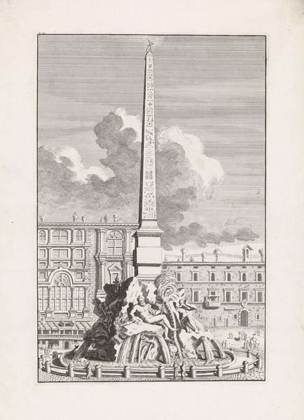 Editor: This is Giovanni Battista Falda’s "Fountain in Piazza del Popolo in Rome," dating from 1653 to 1691. It’s an engraving and etching – a cityscape with elegant figures, rendered in fine lines. I find its formality and stillness rather striking. What do you see in this piece that maybe I'm missing? Curator: What I find fascinating is the dance between grandeur and everyday life, all caught in ink on paper! Imagine the sheer audacity of Domenico Fontana, the architect, daring to manipulate water, stone, and public space. Falda then captures it – not just the fountain, but the pulse of Roman life around it. Notice how those tiny figures aren’t merely decorative. To me they whisper stories of commerce, social hierarchy, even political maneuvering! Editor: So the people add another layer to the fountain's presence? Curator: Exactly! It’s like Falda's handing us a little stage, and saying, "Look! Here’s how power presents itself and how life swirls around it!" Do you think the figures seem overwhelmed by the scale? Editor: Well, now that you mention it, maybe a little. The fountain definitely dominates the scene. I was focused on the precision of the architectural rendering and the neatness of it all. Curator: Precision is Falda's genius, his way of freezing a moment of time for our scrutiny. Perhaps in that control, he subtly comments on the controlling forces of the Baroque era. It is worth keeping in mind that "Fontein op Piazza del Popolo te Rome" captures the moment when an ancient society transitioned to modern urban life. Editor: This has totally changed how I see it. It’s not just a fountain; it's a statement! I appreciate this. Curator: And I, in turn, admire your fresh eyes noticing what might often get overlooked in well-known art pieces!
