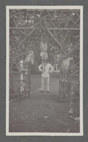 Curator: Let's take a moment to appreciate this photograph, "Vier kinderen hand in hand voor een houten hekwerk in Batoedjadjar," created in 1924 by Klaas (I) Kleiterp. It's a gelatin-silver print. Editor: My first impression is of something quite rigid and contained. The wooden structure looms almost protectively, and yet, it feels like a cage of sorts behind those small, solemn faces. Curator: It is interesting to reflect on the location named in the title and the date the image was captured. Batoedjadjar was situated in the Dutch East Indies, now Indonesia, when this image was taken. Considering the realities of Dutch colonialism during that time and in that location, I think the photograph opens questions of identity and belonging in a space marked by power dynamics. These children are posed within the carefully crafted framework that could either denote privilege or restriction. Editor: I see that too. And yet, consider how children often appear in photographic portraits: arranged like symbolic emblems. Look at their clothing--it evokes certain values attached to cleanliness, social positioning. The image has layers. The gesture of holding hands evokes innocence and solidarity but the wooden beams and overall monotone add complexity and darkness to what appears to be a straightforward image of childhood. It's almost a stage set for deeper psychological readings. Curator: Indeed. How do these carefully chosen symbols intersect to communicate something deeper about representation? The children's fixed stares, hand-in-hand—are they performative, or a display of imposed togetherness under colonial forces? Are they embodying a staged narrative or offering something genuine, like solidarity? Editor: I think it is important to reflect on childhood itself as a symbolic territory here. Childhood often represents a concept—innocence, potential—as opposed to an experienced reality. When an image of a child emerges, we should remember that a culturally constructed symbol is presented. And these specific children—pictured in this way, against the latticed backdrop, become powerful conduits for meaning. Curator: Absolutely. Kleiterp’s image, viewed through our contemporary lens, becomes a fascinating focal point for these discourses on visibility and experience. Editor: Precisely! This artwork offers more than what initially meets the eye. It is a springboard for considering the role of symbols and their historical baggage when recording any image.