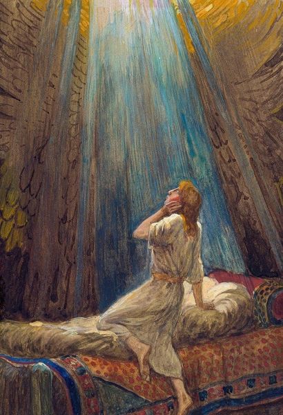 Odilon Redon created this pastel artwork, 'Boat with Two Figures', sometime in the late 19th or early 20th century. The composition features a boat cutting through the water, dominated by a large sail that occupies much of the upper left quadrant. This pale sail sharply contrasts with the dark night sky, speckled with stars. Redon's symbolism emerges through his unique use of colour and form. The figures in the boat are ethereal, their forms dissolved into swathes of colour that suggest rather than define. The juxtaposition of the vibrant orange cargo with the ghostly figures creates a tension, challenging fixed meanings by blending the material and the spiritual. The artwork operates within a semiotic system where the boat may symbolize a vessel of transition, and the figures could represent aspects of the self or the soul. It invites us to question our perception of reality, and recognize the fluidity of meaning inherent in artistic representation.