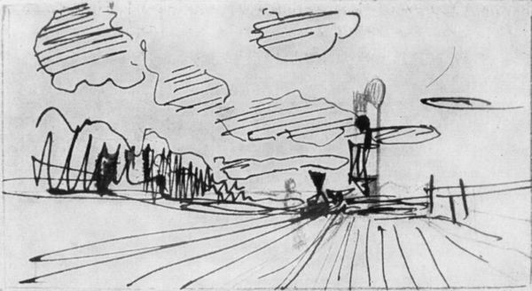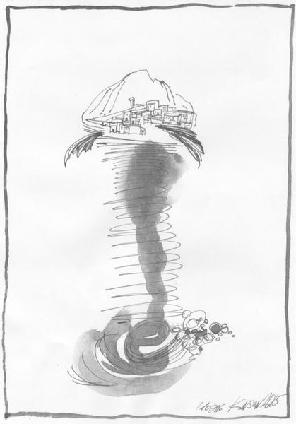 Editor: This is Martiros Sarian's 1971 ink and paper drawing, "Motherland". It’s a very spare landscape. I find the limited use of line quite evocative; what strikes you most about the composition? Curator: The primacy of line is undeniable, wouldn’t you agree? Sarian employs it not merely to delineate form, but to create it. Note the strategic variations in line weight—heavier contours grounding the composition versus the ethereality implied by thinner, sketch-like lines defining the sky. What structural relationship can be inferred from the sky relative to the landmass? Editor: It seems to me that the shapes suggesting clouds almost mirror those indicating hills, bringing visual unity despite the division. How does this interplay of shapes inform our understanding? Curator: Precisely. This mirroring suggests a formal equivalence, almost as though land and sky are interchangeable. What if we read this as a comment on the essential interconnectedness of landscape elements, moving beyond a simple representation toward a symbolic construction? It reminds us that an image does not need many shapes to contain volume. Editor: So it’s not just a drawing of a landscape, but a meditation on form and connection? I hadn't considered that interplay as central to the piece before. Curator: Precisely. By abstracting the landscape to its barest essentials, Sarian invites us to contemplate the fundamental structures that underlie our perception of the world. This reveals how simplicity can provoke more profound thought than a complex composition would permit. Editor: That’s fascinating. Now I'm thinking differently about what constitutes a landscape, focusing more on composition than just representation. Curator: Indeed. Close looking allows us to deconstruct familiar artistic traditions to discover new avenues of insight and understanding, by moving beyond what is immediately obvious.