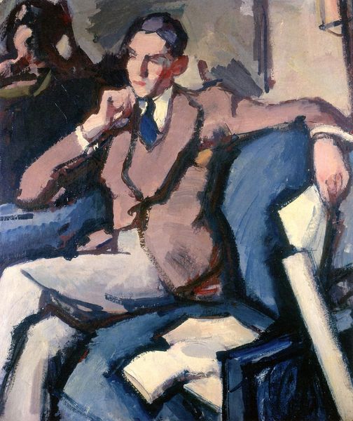 Editor: We’re looking at Alberto Giacometti’s “Self-Portrait” from 1921, an oil on canvas work. The way Giacometti captures himself, seated, actively painting – there's a compelling dynamism even in this early piece. I'm struck by how he depicts himself both as the subject and the creator. What is your interpretation? Curator: Notice the painting's composition. Giacometti has created a fascinating play of depths, hasn’t he? The arrangement of vertical and horizontal lines, created by the easel, the wall, and even the artist’s body itself, produces a structural scaffolding within the image. How does this scaffolding affect your viewing of the work? Editor: I hadn't considered that specifically, but the intersection of those lines certainly emphasizes the flatness of the picture plane, despite the implied depth of the room. Curator: Precisely. The artist simultaneously constructs and deconstructs the illusion of space, drawing attention to the painted surface. This modernist flattening is key. Consider too the materiality: the visible brushstrokes, the textured application of paint, and the muted, almost melancholic palette, work to emphasize the act of creation, foregrounding the "how" of art rather than merely the "what." It's about process, not just representation. What feeling do you derive from the tonality? Editor: There’s a sense of introspection; it's serious, deliberate, even somber. It pulls the viewer in close for an intimate, if restrained, encounter. Curator: I agree. Giacometti is offering us not simply a likeness, but an engagement with the fundamental properties of painting: line, color, texture, and structure. We can clearly appreciate here Giacometti's emerging interests in representing the self, interests that clearly extend far beyond pure mimetic representation. Editor: Looking at it this way really highlights Giacometti’s formal exploration as a vital element in understanding his artistic vision. Thank you!