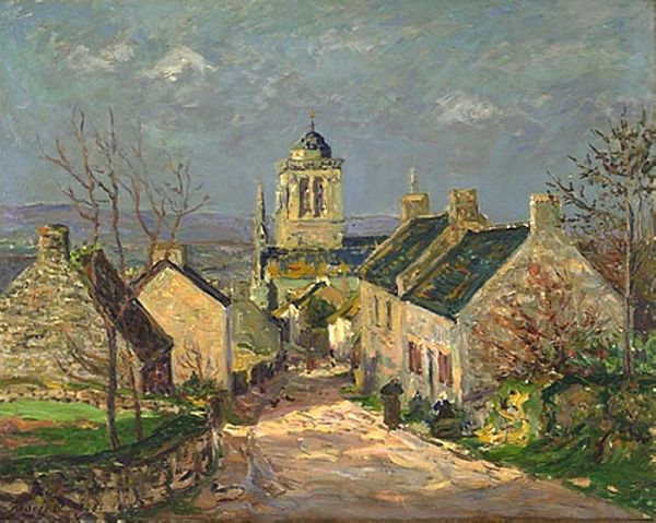 Maxime Maufra painted "The Village and Chapel of Sainte-Avoye (Morbihan)" with oil on canvas. Maufra, born in 1861, lived during a time of significant social and artistic change in France, marked by industrialization, urbanization, and the rise of new artistic movements. Here, the chapel stands not just as a religious symbol, but as a focal point of community identity. Maufra's choice to depict this village scene reflects a desire to capture the essence of rural life and cultural traditions in a rapidly changing world. The brushstrokes give an emotional texture to the scene, suggesting a deep connection to the land and its people. "I've always looked to nature, because it's from nature that everything comes". Maufra’s painting invites us to consider the interplay between the built environment and the natural world. The presence of the church speaks to the influence of religious and social structures in shaping community life, while the surrounding landscape speaks to the enduring power of nature.
