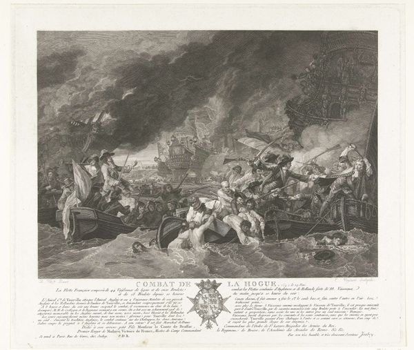 Editor: Here we have William Woollett’s "Battle of La Hogue." The plate measures about 48 by 62 centimeters. It feels very dynamic, a true depiction of chaos. What compositional elements stand out to you? Curator: The composition is clearly divided, isn't it? Note the stark contrast between the swirling, chaotic sea and the rigid, almost architectural rendering of the ships. Consider how Woollett employs light and shadow to draw the eye – directing our focus toward the human drama unfolding in the foreground. Editor: That’s a great point about the foreground. So the human figures are really the focal point. Curator: Precisely! The figures are rendered with a detail that elevates them. I wonder how Woollett conceived the tonal arrangements to structure our experience of this event. Editor: I see what you mean! I'm noticing new things. Thanks! Curator: It is through the arrangement of forms that meaning emerges.