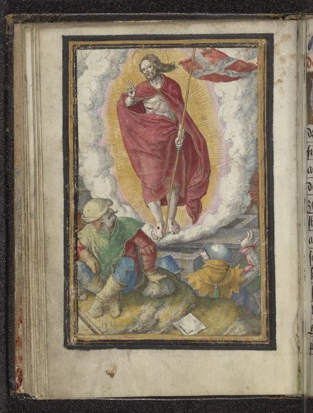 Curator: What strikes me most is the overall sense of contained luminescence – a tiny burst of stained-glass narrative right there on the page! Editor: Indeed! We are looking at "The Coronation of the Virgin," a coloured-pencil drawing dating from around 1530 by Lucas van Leyden. You can find it here at the Rijksmuseum. Curator: That Northern Renaissance style really comes through, doesn't it? It feels so immediate, even with such a traditionally symbolic subject. The tight composition is a jewel box. It practically demands quiet contemplation! Editor: Precisely. Observe how van Leyden has arranged the figures of Christ and God the Father bestowing a crown upon the Virgin Mary. The placement of the Holy Spirit as a dove directly above creates a powerful vertical axis – almost like a conduit between heaven and earth, wouldn't you agree? Curator: Oh, completely! And the cherubic faces clustered below her feet add this wonderfully earthy, almost playful counterpoint to all that solemnity. They look as though they know something we don’t… like some delicious heavenly secret. Editor: A delightful interpretation. Formally, one can't help but notice how van Leyden balances colour and form. See how the drapery is rendered – with precise line work which anchors the dynamism in the piece. Curator: But the colors sing out! Those almost acidic yellows haloing each figure…and that wonderfully calming cerulean that envelops Mary. They add so much… yearnings for a sort of serenity? I get the most fascinating shivers down my spine simply staring! Editor: A fitting emotive response, certainly. Looking at the material elements: this work, being a drawing executed with colored pencils, encourages an immediate physical intimacy. It has all the character of a carefully preserved devotional artifact. Curator: That's it precisely: "devotional." After studying this tiny piece, I'm overcome by a strange sense of intimate holiness. It's as if Van Leyden bottled some of the purest essence. It’s as if it holds some magic portal... Editor: An engaging summation that unites technical mastery with spiritual reflection! A valuable thing for each viewer to uncover for themself, don't you agree?