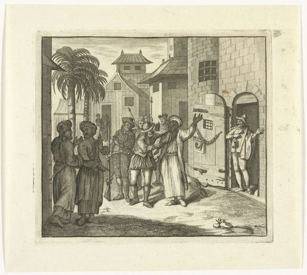 Curator: This is Horace Vernet's print, "Soldaat Jacques Grivet viert de vrede, 1797," created between 1818 and 1819. It's a lively scene, mostly done with engraving and drawing techniques. What's your immediate reaction? Editor: It feels like a staged moment of camaraderie. Everyone’s striking a pose, almost theatrical, in the way they engage with one another after what I understand is the declaration of peace, celebrating it. But also, slightly artificial in the rendering—striving, it seems to me, for historical gravitas, but teetering instead to caricature. Curator: Well, the staging makes sense when you consider its likely intended audience. Vernet was adept at crafting narratives that reinforced specific ideas of patriotism and virtue, crucial for consolidating power in post-revolutionary France, in a post-Napoleonic context for that matter. So, the camaraderie might be more of a symbolic promotion. Editor: I see that angle clearly! Note that the broken plank, or maybe it is an unused door that is almost like an altar! What is being ‘consumed’ on top? How many libations have these ‘patriots’ poured. There is this need to always sanctify victory, create rituals for celebration which include the vanquished too. Curator: I agree about that plank altar and spilled libations that accompany military might. Here’s what seems very revealing. The central figure raises his arms high in the iconic posture we will later associate with photographs of conquering soldiers, a theme he will explore throughout his life, to his association with photographing the Crimean War. These iconographic patterns of domination are being embedded even here. Editor: Precisely! This visual language echoes far beyond this particular print. Look also at how he's including, visually, what looks like common villagers on the sides! Almost literally making them complicit, with celebratory music accompanying the main actors. How does the presence, I wonder, or inclusion, of ordinary folk bolster the heroic narrative that the scene otherwise struggles to convey on its own? Curator: In Vernet's time, these representations served to normalize military culture, to embed it in the fabric of daily life. These inclusions were meant to imply shared cause. Consider the sociopolitical ramifications of portraying citizens swept up in the celebration of military victory. It definitely bolstered and gave the political-military class, in those decades, further impunity. Editor: Fascinating. And from that angle, what at first appeared staged and artificial reveals a deliberate ideological purpose. Vernet isn't merely depicting a scene, he's actively shaping cultural memory, to legitimize an action like war. Curator: Exactly, framing military celebration as a collective aspiration helps solidify control and cultivate a unified national identity under any government. Something that he perfected. Thank you, these few moments opened the discussion on the cultural effect that Vernet achieved in making sure war finds easy approval within ordinary folk!