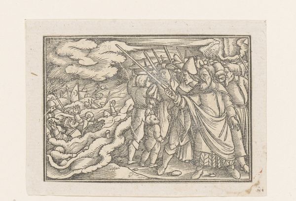 Editor: This print, titled "Abigail Asks David for Forgiveness," dates back to 1543 and is by an anonymous artist. It's done in ink on paper, and what strikes me most is how incredibly detailed the whole composition is. There are so many figures. How do you interpret this work? Curator: The scene pulsates with loaded cultural symbolism. Consider Abigail's pose – kneeling, offering gifts. This isn't just about an individual seeking forgiveness; it embodies the historical and almost ritualized gestures of diplomacy. Gifts served as powerful metaphors for negotiation. Notice the crowd, the almost identical faces. Editor: Yes, there are quite a number of individuals, it looks like a gathering of warriors on one side, and then a different class of women to the right. Are these class differences represented? Curator: Indeed! It points to societal structures and gender roles inherent in this historical narrative. David, the powerful leader, the warriors, are posed opposite the women who appear to serve the narrative, in this instance as agents for diffusing a tense situation. What is transferred or transmitted by this opposition? Consider, as well, that prints like these often served didactic purposes, shaping collective memory and reinforcing social hierarchies. Does it successfully tell the story? Editor: It does seem effective. It gives insight into societal standards. What I notice, and perhaps because of its effective transmission of an age gone, I am happy it’s framed, printed, and safely behind glass. Curator: An interesting contemporary reflection that, too, speaks to evolving ideas around memory and our interaction with history! Thanks, I have enjoyed reflecting on the cultural memory embedded in visual symbols today.