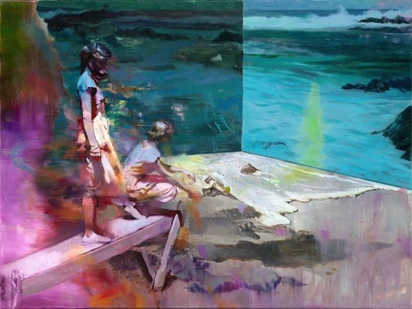 Joshua Flint’s painting, ‘The Wide Arena of Air,’ feels like a memory or a dream, hazy and half-formed. It’s made with thin layers of oil paint, almost like watercolor, allowing the white of the canvas to peek through. I like how the figures are integrated into the landscape, almost dissolving into it. Look at how the woman wading into the water, her legs becoming part of the watery scene. The paint drips and runs, mirroring the flow of the water. Then there’s the boy, his form merging with the rocks and trees. This way of working, where the image is built up through layers and the process is visible, reminds me of Gerhard Richter’s blurred paintings, where the subject is both present and absent, creating a sense of longing and uncertainty. It's a reminder that art is always in conversation with itself, borrowing and transforming ideas across time. It suggests that meaning is never fixed but always open to interpretation.