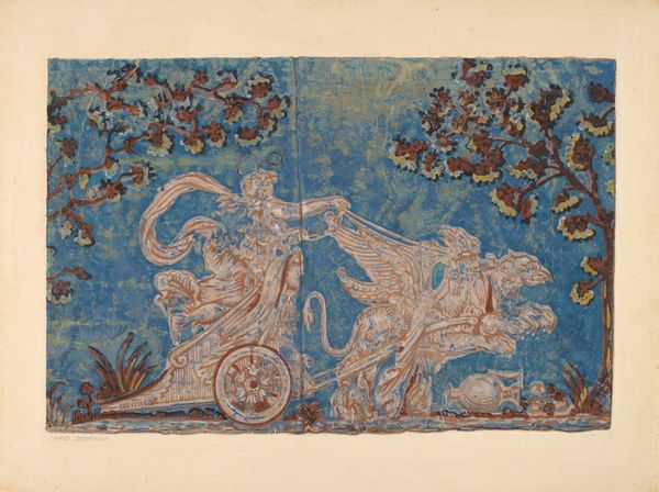 Curator: Immediately striking is this azure background – a flat, vibrant plane upon which all other forms are laid. Editor: Agreed. The texture also suggests something hand-made, hinting towards an unpretentious application, where the artist embraces, rather than hides, its material process. Shall we introduce the piece? Curator: Absolutely. We're looking at David Dorfman’s "Wallpaper," created sometime between 1935 and 1942. It seems to employ both watercolor and drawing. Editor: Wallpaper, indeed. Looking at the composition—the two canids dashing through abstracted foliage against the backdrop. It really echoes motifs of classical hunts in tapestries. Is Dorfman making a knowing reference? Curator: It feels entirely possible. Hunting scenes often symbolize power and nobility. The repeating floral elements… a blue evocative of royal pigment... Perhaps Dorfman uses such iconographic gestures ironically? I do think he uses art history to imbue his pieces with new layers. Editor: Well, speaking materially, such handmade pieces are often seen to challenge elitist narratives. Consider the socio-political mood from the late '30s to early '40s - questioning authority was rife. For what purpose could the design have been? What materials were easily at hand? Curator: Valid, valid... We must be wary of overly neat symbol decoding though. A lively decorative design is apparent and not simply an expression or a signifier of some pre-existing ideology, such design considerations have as much purpose to this work. The work oscillates somewhere between classical and something handmade; in this synthesis, perhaps that speaks most resonantly. Editor: Perhaps we read too much! Although art always speaks through its materiality as much as it attempts representation. We should leave it to listeners to determine that oscillating position for themselves! Curator: Exactly. There's definitely no single right interpretation here, is there? A thought-provoking work regardless. Editor: Indeed. A very energetic work!
