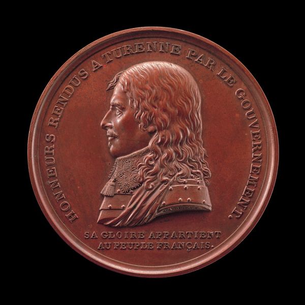 Editor: This bronze sculpture, dating back to 1854, portrays Charles de Brouckère, the Mayor of Brussels. It's a striking profile. The detail, especially in the hair, is incredible. What can you tell me about the imagery present here? Curator: Note the clean lines of the profile and the surrounding text, "Charles de Brouckère Bourgmestre de Bruxelles" (Mayor of Brussels). Consider, now, the use of bronze itself. Bronze is meant to last and commemorate, to transmit meaning from one generation to another, but this is not a full sculpture. What purpose does that flatness suggest? Editor: Perhaps it’s like a coin, to represent a public servant and civic contribution? Curator: Precisely! In rendering De Brouckère in profile like this, the sculptor recalls ancient coins of great rulers, linking his legacy to earlier figures and traditions. What emotions might that classical form evoke in viewers? Editor: A sense of stability, maybe? Something enduring. Almost godlike! Curator: It also represents a very particular set of virtues which we recognize from Renaissance images. The bronze serves as a materialization of respect. How might his constituents react to an artwork celebrating their public servant in this medium and form? Editor: They might be very proud, and the medallion then signifies political power with a sort of humble acknowledgement by Brouckère. I never thought about the link between the figure and the symbolism behind the medium. Curator: By placing this portrait in a lineage of powerful figures and in such enduring material, the image attempts to root De Brouckère within a very specific historical narrative, reflecting both personal ambition and a desire to leave a lasting legacy within the city he governed. What a powerful way to commemorate leadership. Editor: Thanks! I see now the multiple layers of meaning beyond just a simple portrait.