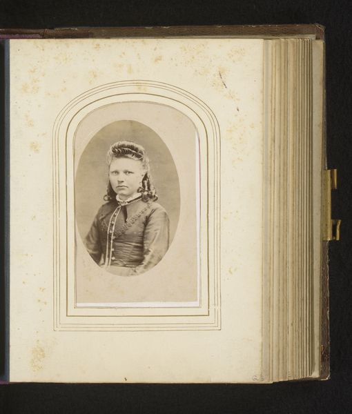 Curator: This is "Portret van een meisje," a photograph attributed to Elias Gottheil, made sometime between 1863 and 1883. It's a gelatin-silver print. Editor: There’s such formality to it. The young girl's posed, holding a riding crop... or perhaps a conductor’s baton? The monochrome gives it a wistful quality, as if capturing a vanished world. Curator: Precisely. Consider the era: photography was becoming more accessible, yet portraits remained deliberate statements about social standing. It’s interesting to think of how newly available technologies influenced portraiture in Europe, the rising middle classes embracing the idea of capturing their likeness. Editor: The riding crop, or baton, takes me to some symbolic places. It may just signal equestrian leisure. But it also makes me consider control, not just the sitter’s posture, but who she might later manage... or conduct! A hint, perhaps, toward future societal roles and what was imposed. Curator: It also subtly reinforced bourgeois ideals. The photograph becomes an object to be collected, exchanged, displayed within the home – normalizing codes of social behaviour and class expectations, a type of aspirational artifact if you like. Editor: Yes, and look at the composition itself. She's presented within that oval frame, a delicate world within a world, both protected and isolated at the same time. Almost like the figures painted on ancient Roman sarcophagi to idealize and contain a legacy. Curator: It speaks volumes about visual conventions of the era, a time when portraiture served specific functions within an evolving society. How the burgeoning technologies affected the older and long revered forms of social depiction. Editor: Reflecting on this girl and this photograph...I keep coming back to a sense of both intimacy and immense distance, separated by the rigid constructs of her time. It's haunting in that way. Curator: Agreed. Seeing this image through both our lenses emphasizes photography's fascinating dialogue between personal identity and larger cultural narratives.